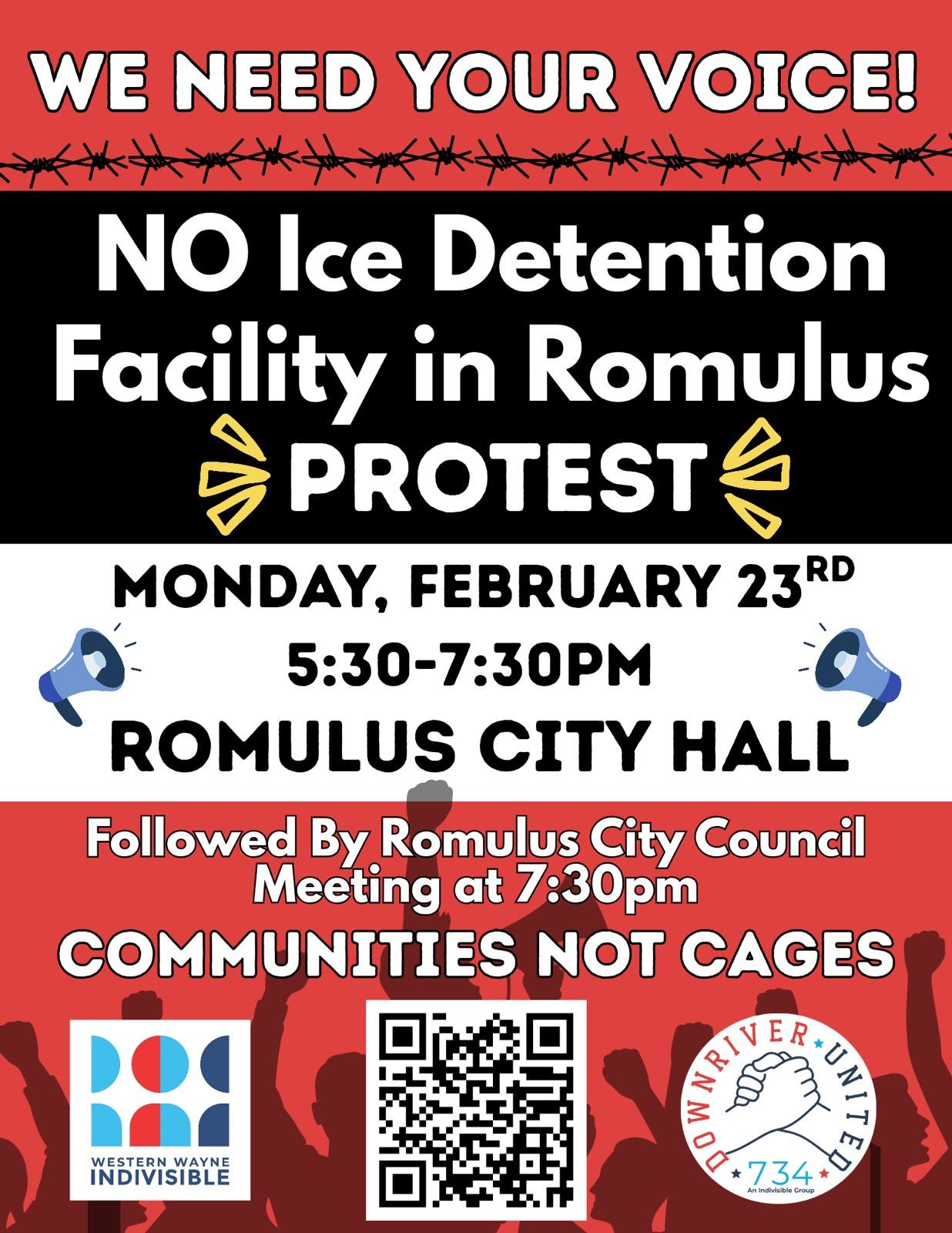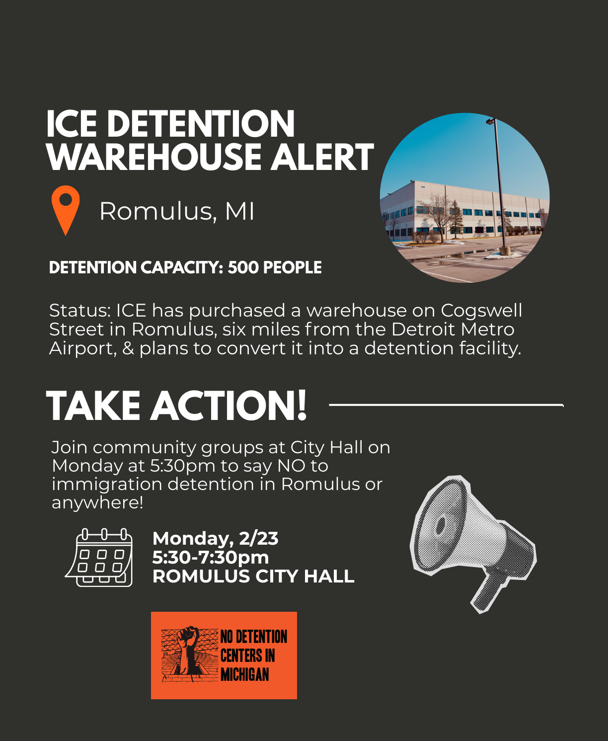 Join community groups at Romulus City Hall on Monday, 2/23 at 5:30pm to say NO to immigration detention in Romulus or anywhere!